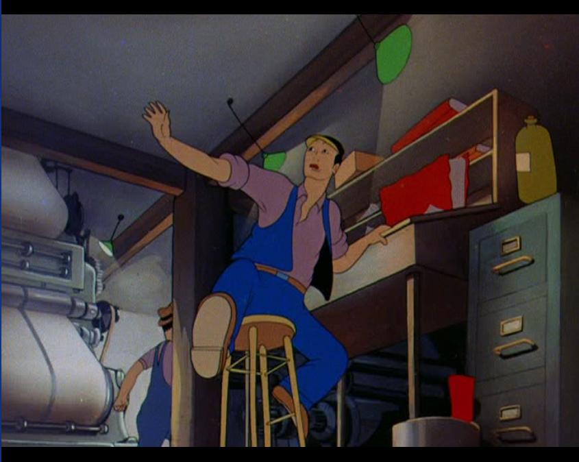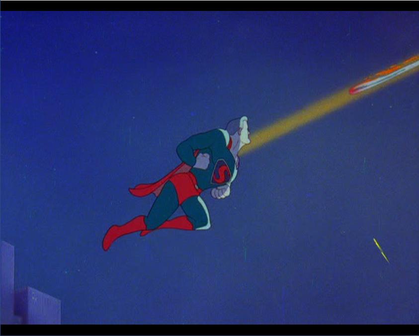 My point about the Blu-ray image quality is that it gives an inkling of how the cartoons might have looked if it had been possible to scan the original cels digitally, rather than being photographed in Technicolor. The Technicolor process requires combining three strips of film, one for each primary color, with each layer having its own grain. The Fleischer/Famous Superman cartoons have always seemed especially grainy, compared to other Technicolor cartoons. Not too bad in SD DVD, but revealing to the point of distraction in HD Blu-ray. I’d compare it to the dust that plagued the layers of glass on Disney’s multi-plane camera. Technicolor’s color saturation is appealing, but it can also go too far, along with changes in contrast.