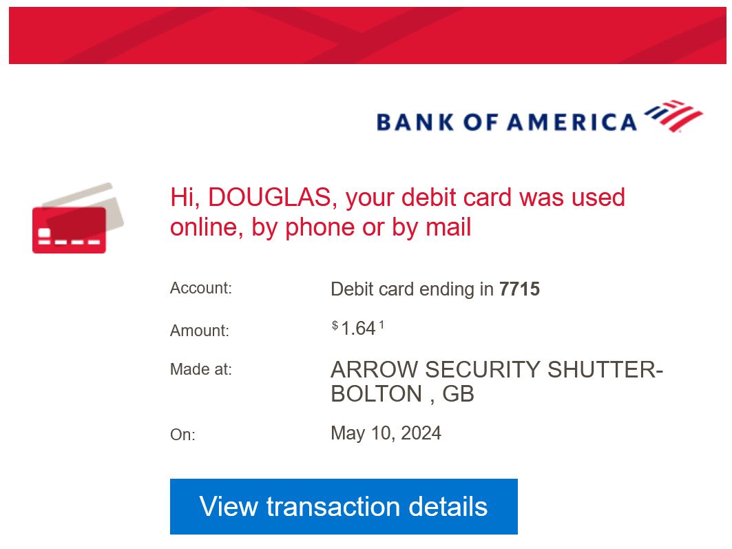 Checking my e-mail, this was what I saw. There’s no reason to hide the last four digits of the card. It was deactivated within half an hour of my seeing the notices, and a new card is being sent to me by Bank of America.
