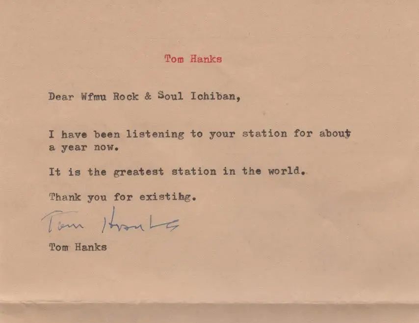 As mentioned in that video, Tom Hanks is a typewriter fan with a sizeable collection. This is the typed letter that Tom sent to Debbie Daughtry, who left WFMU and set out on her own to start Boss Radio 66. So now I send money to both stations.