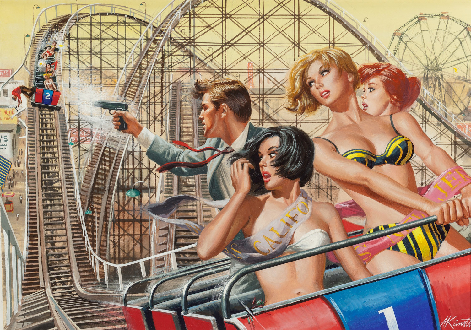 Coaster Kept a Rollin’ Revealed! Beauty pageant girls escaping from Donald “Grabby” Trump. Painting by Mort Künstler