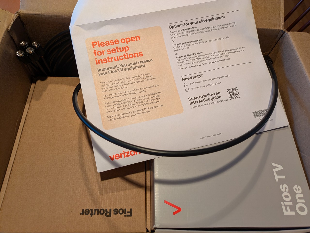 On the front porch yesterday morning there was a big box from Verizon, filled with equipment — a new router, DVR and STB. They don’t want the old gear returned.