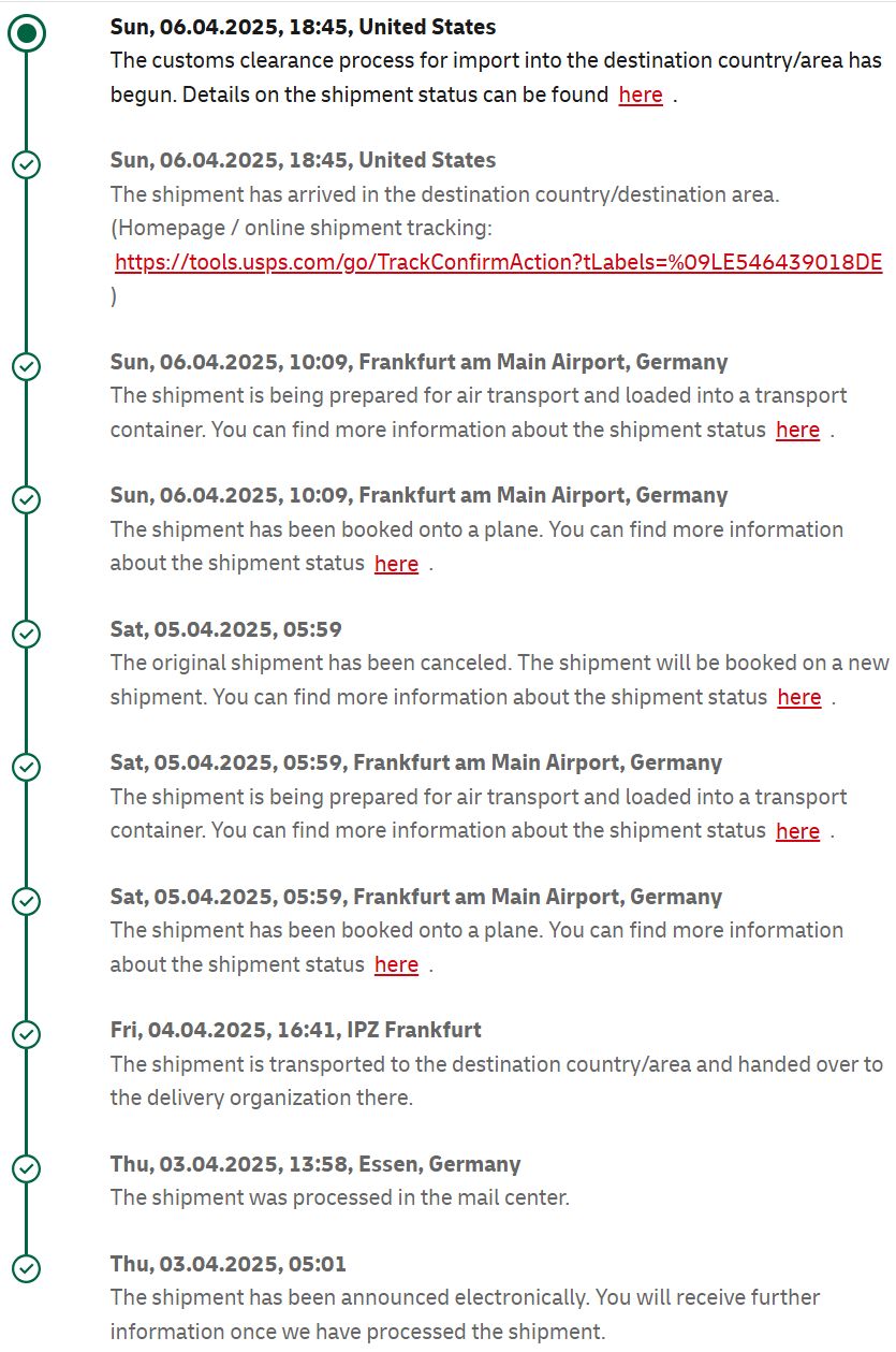 This screen shot shows the progress of my Thakker turntable belt shipment from Germany. After an initial hitch, the package has made its way to the United States. Will the customs clearance process result in a 10% tariff, payable upon delivery?