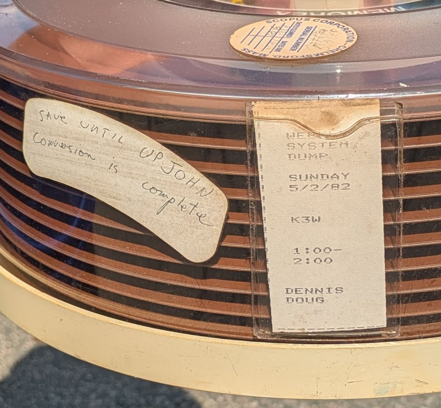 1. JD shared a photo of the ol’ disk pack with me… ah, the memories! As much of printing and chopping those little dump labels as of performing the dumps themselves! (“Dumps”… no “backups” then lol)