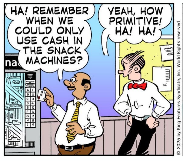 Dustin debuted in 2010, eighty years after Blondie. Checking today’s comics, I see the much older comic strip presents a modern take on vending machines, and vice versa for the newer strip.