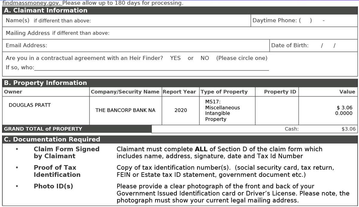 The state treasurer’s office is holding onto $3.06 that I’m owed, for some reason that completely eludes me, as I’ve never had any direct involvement with Bancorp. “Miscellaneous Intangible Property” sounds something like one of those silly Non-Fungible Tokens. I’m not going to all of the trouble documented in Part C., just to get a few bucks. The Commonwealth of Massachusetts is welcome to keep it.