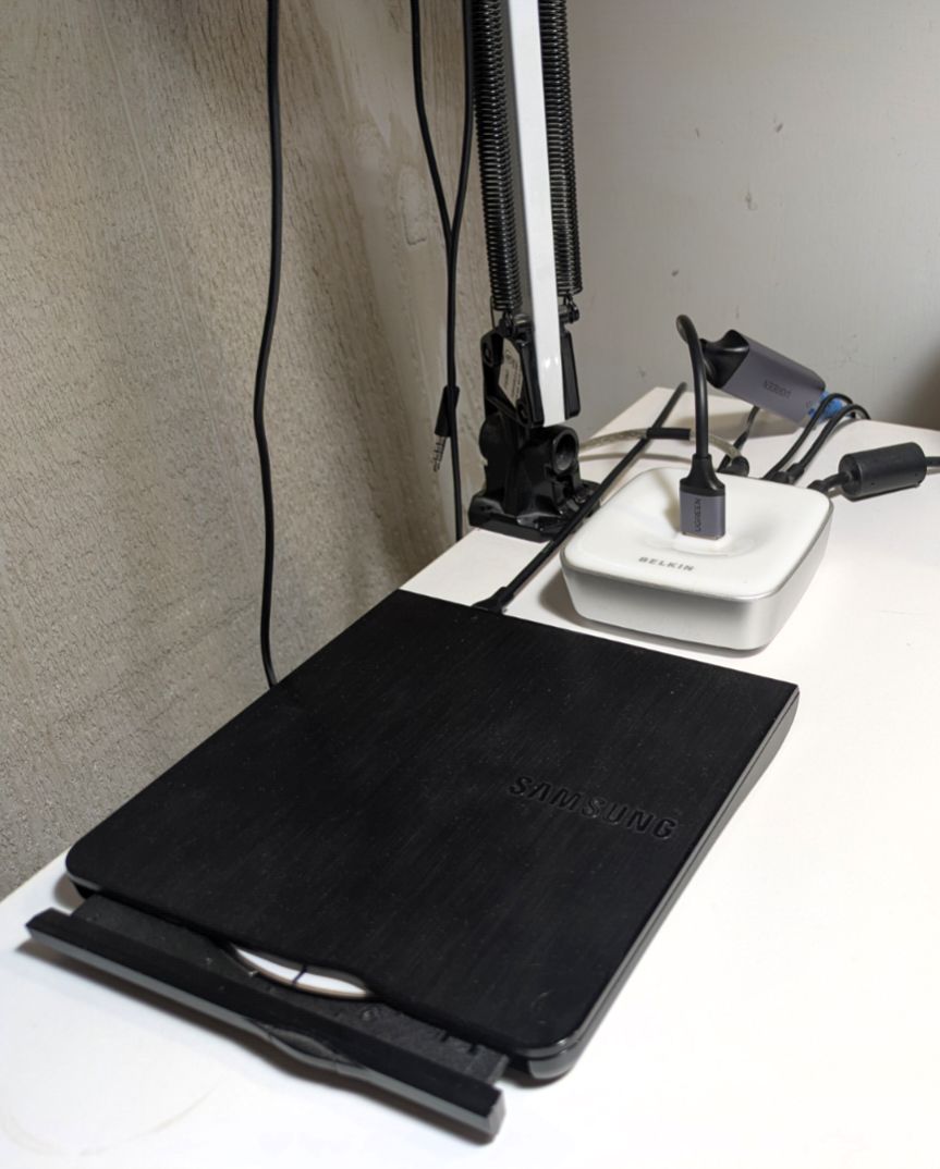 The Lenovo laptop has only one standard USB-A connector. I used it to put an old, long idle, Belkin USB-2 powered hub back into service. It’s fully loaded with a mouse, DVD-RW drive, laser printer, and an Ethernet adapter from a previous project. One less Wi-Fi connection competing for the airwaves.