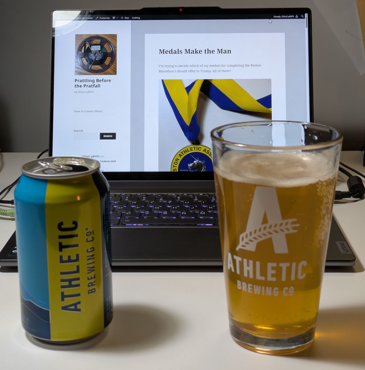 Athletic was there. I explained to the representative that I enjoyed their products, and I said thanks for Athletic’s financial support of an organization promoting participation in marathons. In return, she gave me this Athletic Brewing Co. glass. Thanks, Athletic!