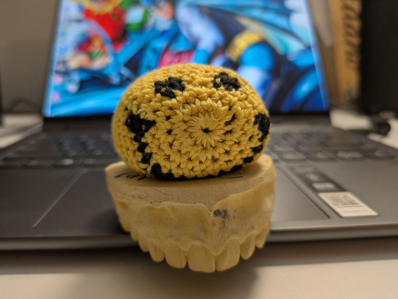 I don’t have a crochet hacky sack of the Earth like Ryan/Ryland has, but I have one with a smiley face. I keep it seated on a plaster cast of my smiling upper teeth as they were 45 years ago. I call it “Smiley Smile”.