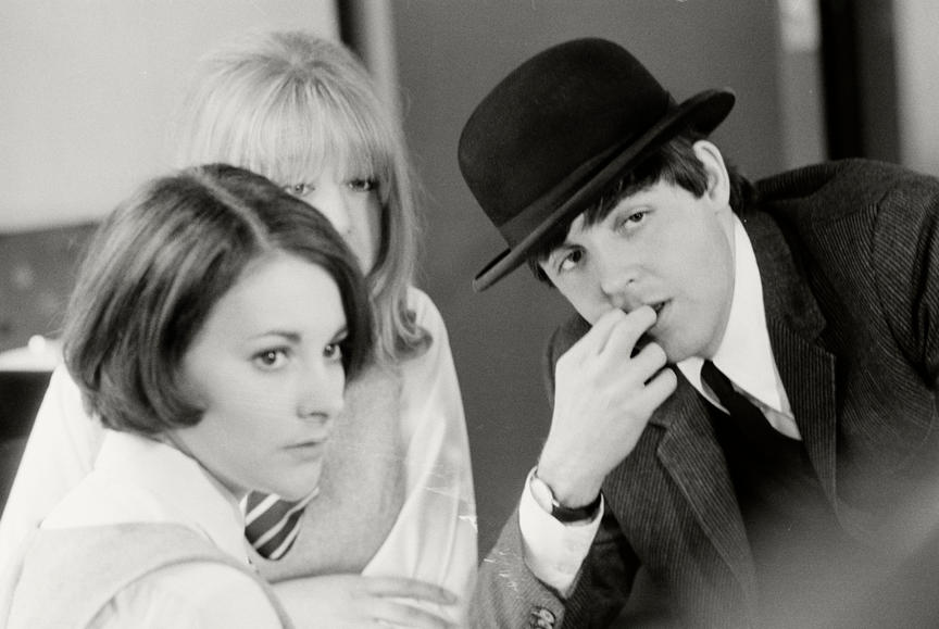 Previous ImageNext Image Paul McCartney with Prudence Bury and Pattie Boyd playing school girls on a Hard Days Night Train.